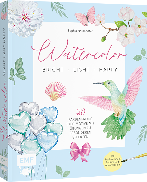 My book Watercolor — Bright, Light, Happy is a hands-on guide to modern watercolour painting, featuring 20 vibrant step-by-step motifs and exercises in special techniques. Included is a piece of high-quality Bockingford watercolour paper, so that you can get started rght away. It is designed for anyone who wants to explore the medium with joy and confidence.